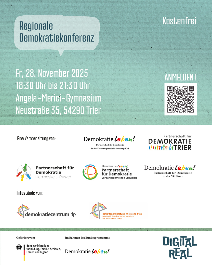 Die fünf „Partnerschaften für Demokratie“ in der Region (Hermeskeil-Ruwer, Konz, Saarburg-Kell, Schweich, Trier) laden Euch herzlich zur regionalen Demokratiekonferenz ein.